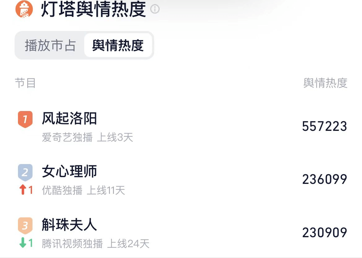 该剧除了收视率爆棚,在网络讨论热度上也十分高涨,灯塔专业数据统计平台给出的舆情热度排行榜,《风起洛阳》舆情热度已高达557223,而《女心理师》对应指数为236099,《斛珠夫人》为230909,粗略的估算了位列第二和第三的剧作热度,其热度总和都没有《风起洛阳》一部作品的热度高。