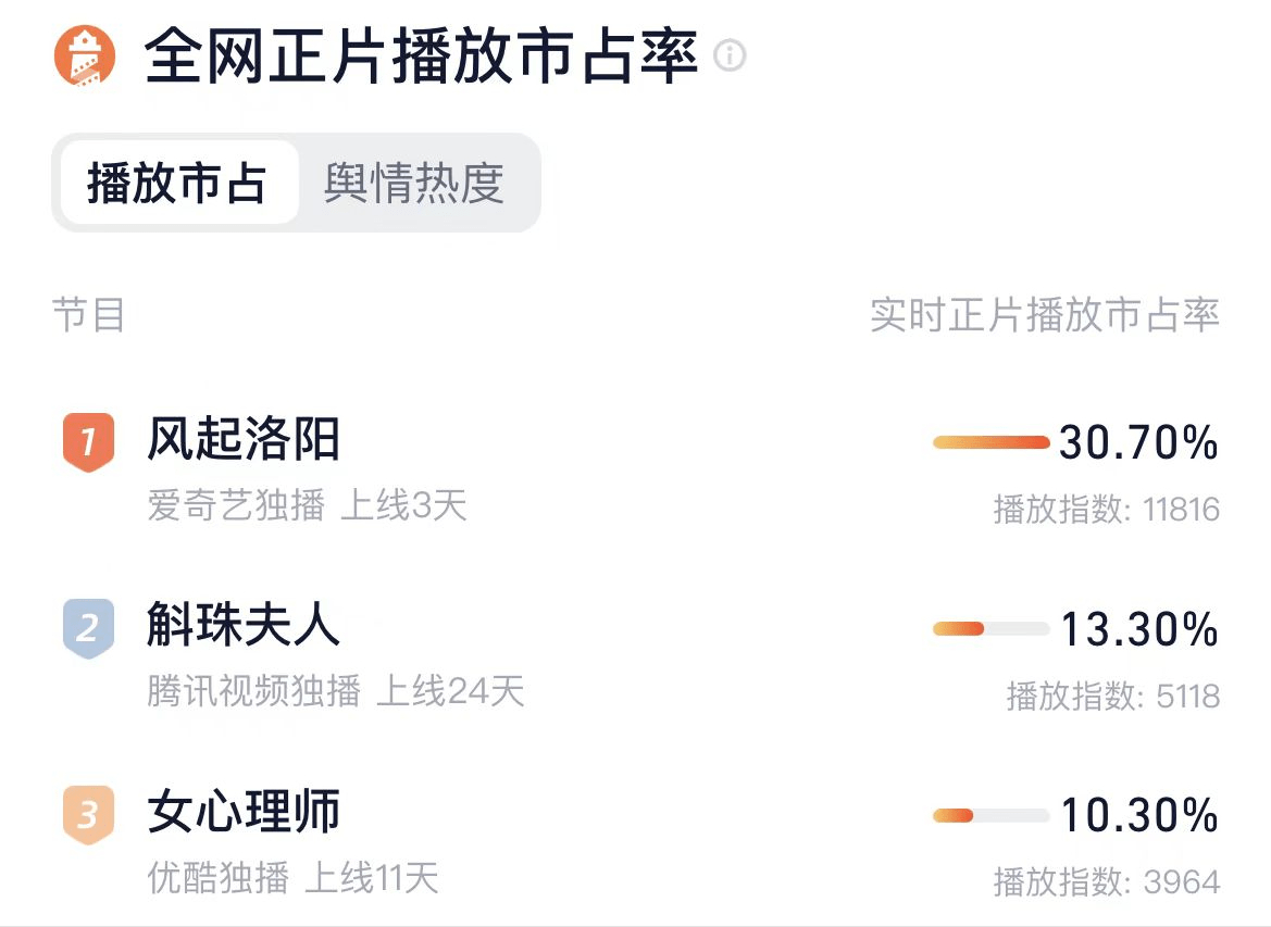 从灯塔专业数据统计平台的统计结果来看,《风起洛阳》上线3天,实时正片播放市占率几乎保持在30%左右,比第二名上线24天的《斛珠夫人》超过了16%个百分点,比第三名上线11天的《女心理师》超过了19%个百分点。