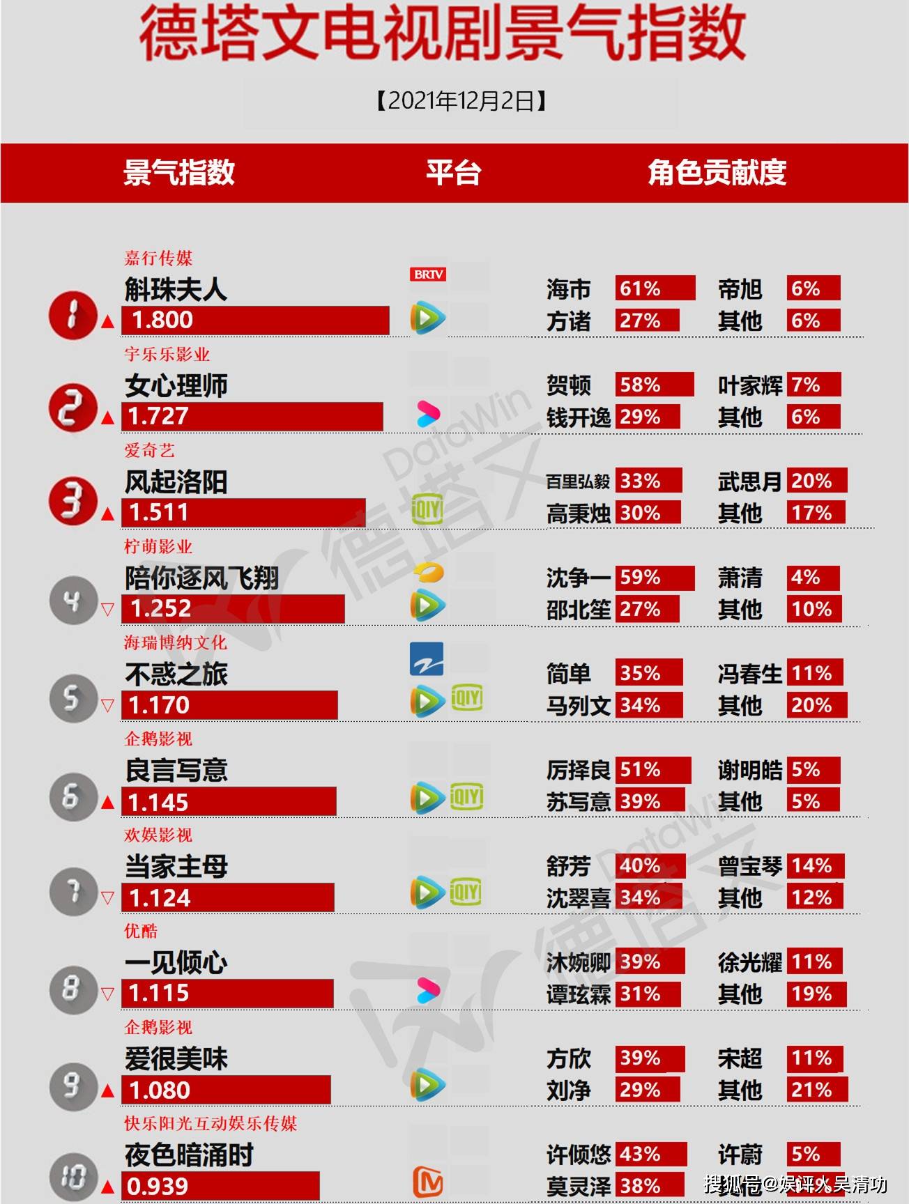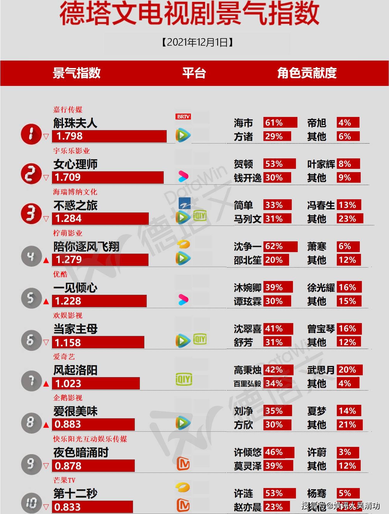 序言:据德塔文电视剧景气指数2021年12月2日显示,《斛珠夫人》《女心理师》《风起洛阳》分别前三,这三部电视剧正好都是顶级流量主演的,说明电视剧是离不开顶级流量的,但电影可以。