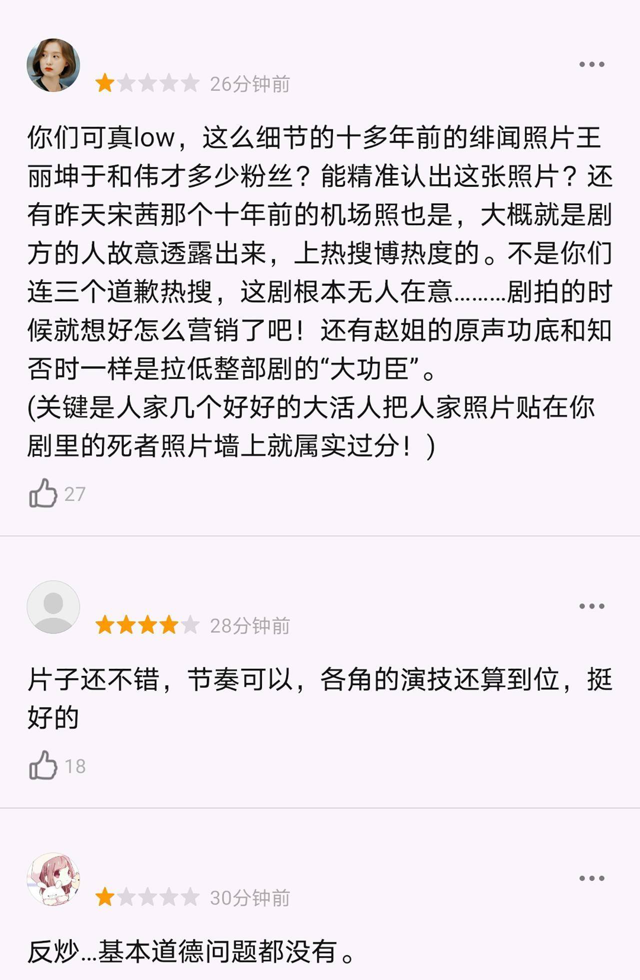 也有剧粉表示:后边还有10集,赶紧先审查一下,看看有没有不该用的照片,再好的电视剧也经不起这么多剧外的折腾啊。