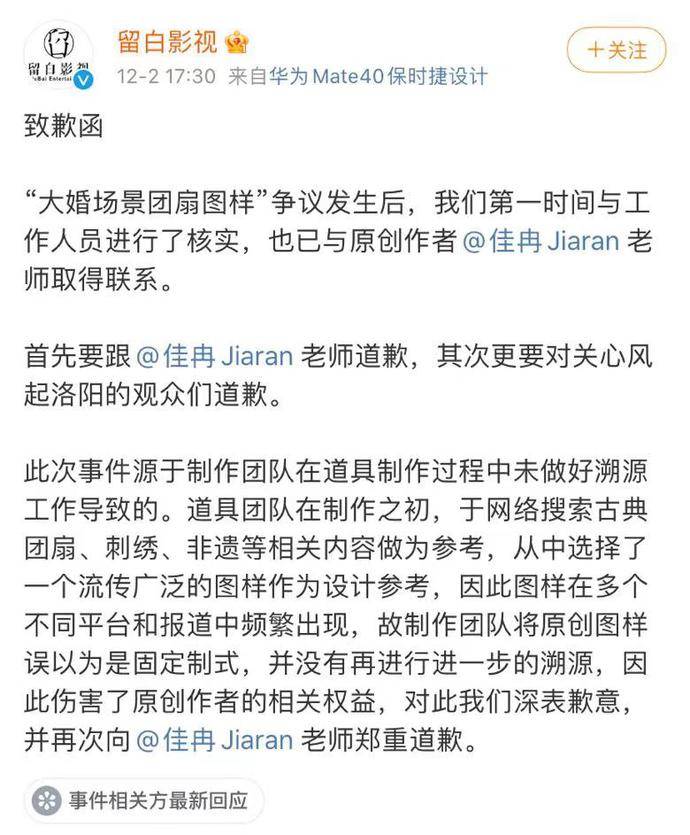 留白影视发表致歉函,称在争议发生后第一时间便与工作人员进行了核实,也与原创者取得了联系。致歉原创者的同时也向所有观众道歉。之所以出现抄袭情况,留白影视解释是因为在道具制作过程中没有做好溯源工作导致,以为原创图案是固定制式,因此引用剧中而伤害了原创作者的相关权益。