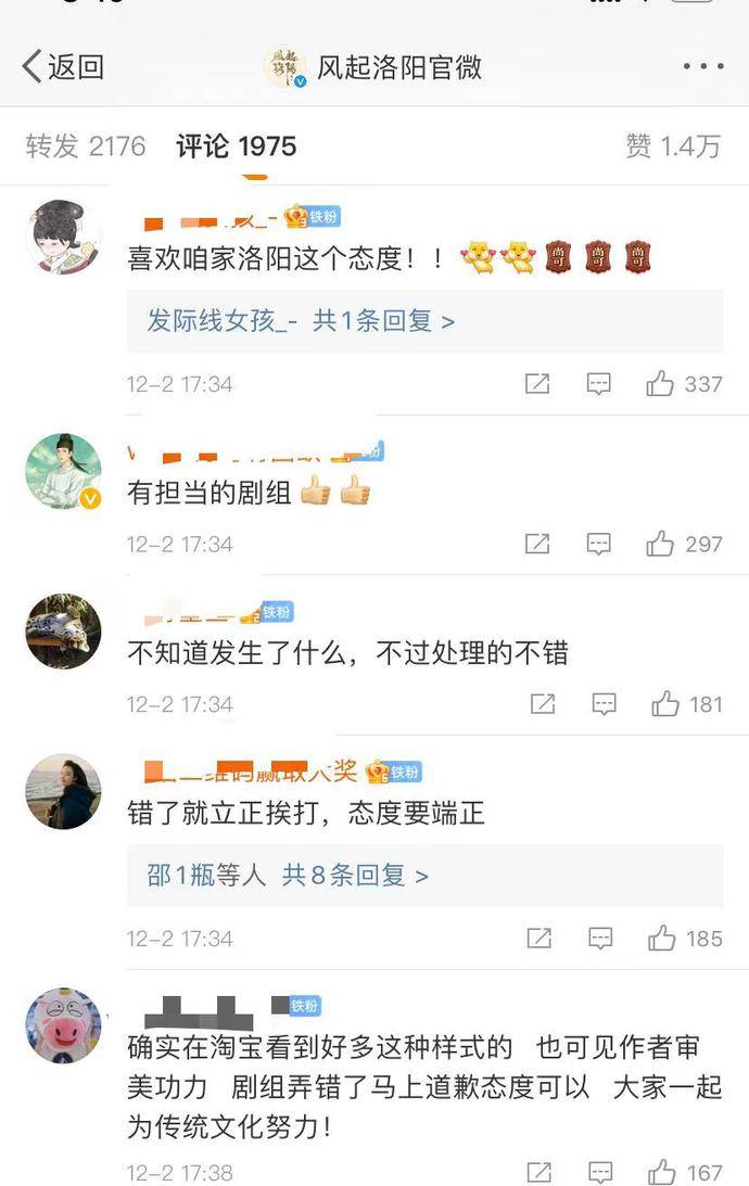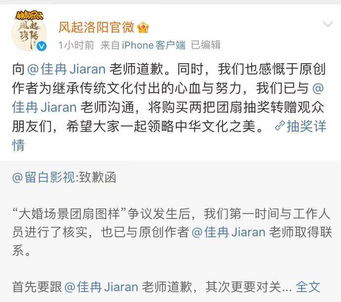 紧随其后,《风起洛阳》官微转发该致歉函并再次致歉原创者,并感谢原创者为继承传统文化而付出的心血与努力。