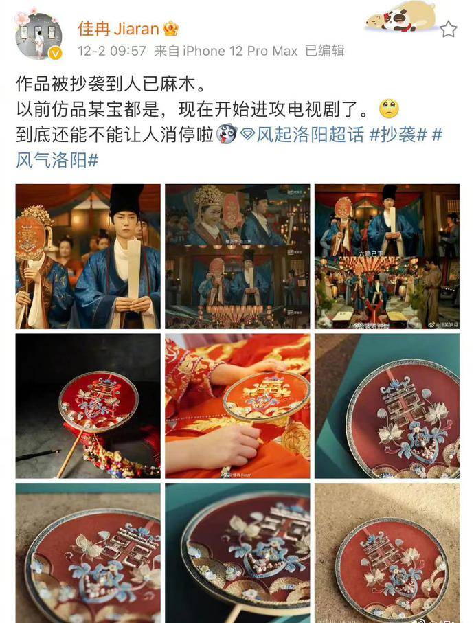 “佳冉Jiaran”表示剧中喜扇的主体纹样、配色以及布局都与自己的作品几乎一模一样,仅仅是有一些细微的变化。而对于《风起洛阳》抄袭一事,该博主相当气愤,直言容不得别人搬运抄袭,偷走属于自己的成果。
