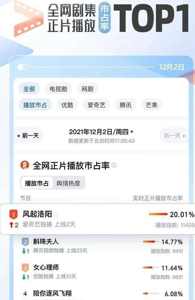 据灯塔专业版数据,截至12月2日17时,《风起洛阳》上线播出第2天,正片播放市占率、舆情热度双榜实时登顶,实时播放市占率破20%,热度飙升。